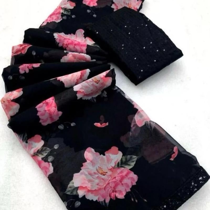 Indian DESIGNER GEORGETTE PRINT WITH BLACK SEQUENCE WORK LACE BORDER SAREE unstitched