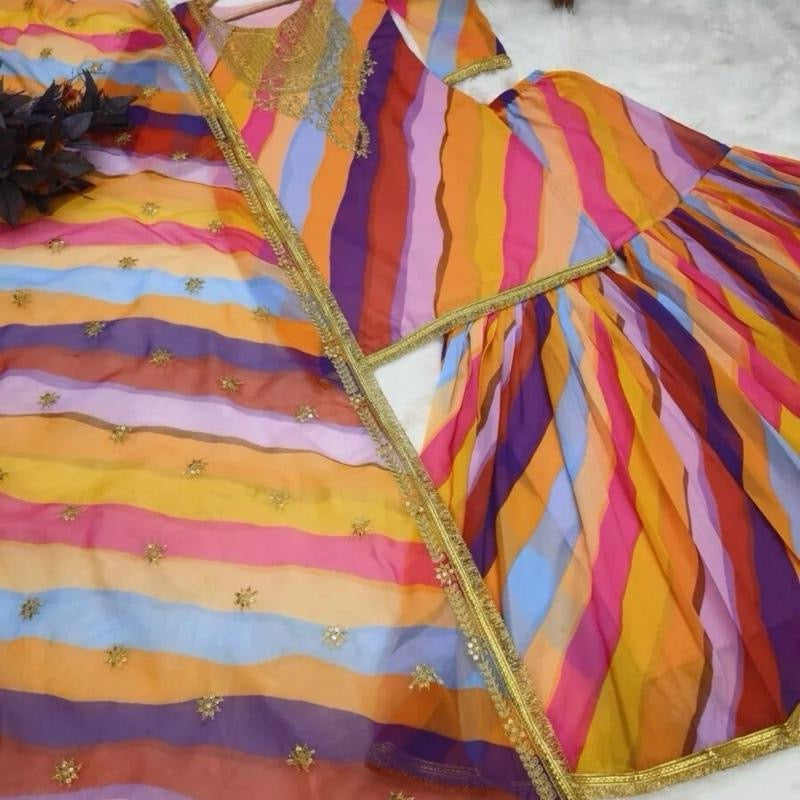 LENGTH :- 32 INCH NECK: ROWND SLEEVES : - WITH EXTRA SHARARA FABRIC :- FAUX GEORGETTE WORK :-EMBROIDERY SEQUENCE CODING AND PRINT WORK