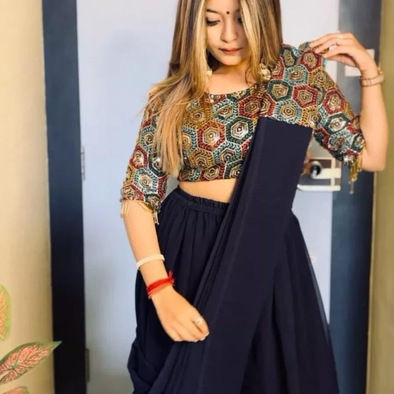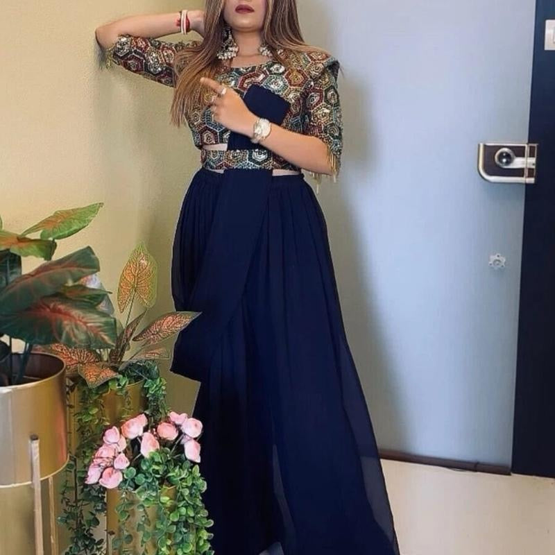 New Georgette Multi Thread Embroidery Sequence Work Blouse Palazzo Belt with Dupatta size-42